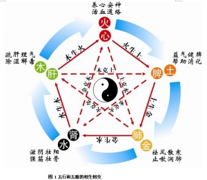 五行相生关系如下:木生火、火生土、土生金、金生水、水生木。对应五脏之间的相生关系是:肝生心、心生脾、脾生肺、肺生肾、肾生肝。相生关系使得各脏器能得到其他脏对它的资助和营养,从而可以发挥出最佳的功能状态。①肝生心:肝藏血,肝气升发,所藏之血能够补养心血,则心血充足。反之,如果肝气郁结,升发功能异常,则心脏的气血功能会出现异常。②心生脾:心血滋养脾土,助脾运化。另外,心血的温煦作用可以使胃温暖,从而起到腐熟水谷的作用。如果心火衰微,则胃土冰寒,食物不能被腐熟,出现完谷不化,不欲饮食等症状。③脾生肺:饮食入于胃,经胃腐熟,小肠吸收,借脾上属于肺,通过肺之宣发肃降,将营养物质输布全身。“借脾上输”即所谓“脾生肺”。④肺生肾:肺将脾运输来的营养物质通过宣发和肃降进行分配,其中一部分下行成为肾脏的营养来源。如果肺的肃降功能出现问题,肾营养物质的来源出现障碍,出现肾亏。⑤肾生肝:肾藏精,肝藏血,精能生血,肾藏精以滋养肝血,肾阴资助肝阴以防肝阳上亢。