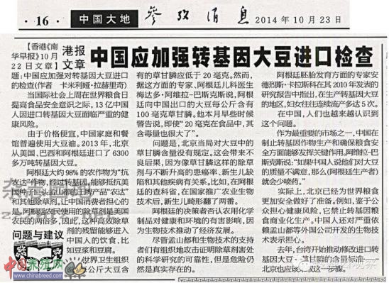 《参考消息》2014年10月一篇文章曾发出警告《中国应加强转基因大豆进口检查》,文章提到,世界卫生组织说,每公斤大豆含有的草甘膦应低于20毫克。然而,阿根廷向中国出口的大豆每公斤含有100毫克草甘膦,13亿中国人因进口转基因大豆面临严重的健康风险。
