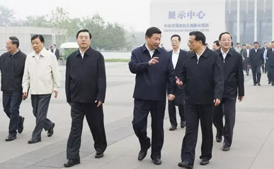 图为:2013年9月30日,中共中央政治局在北京中关村以实施创新驱动发展战略为题举行第九次集体学习。这是习近平、李克强、张德江、俞正声、刘云山、王岐山、张高丽等参观中关村科技创新企业、科研单位重要创新成果后,边交谈边走向会场。