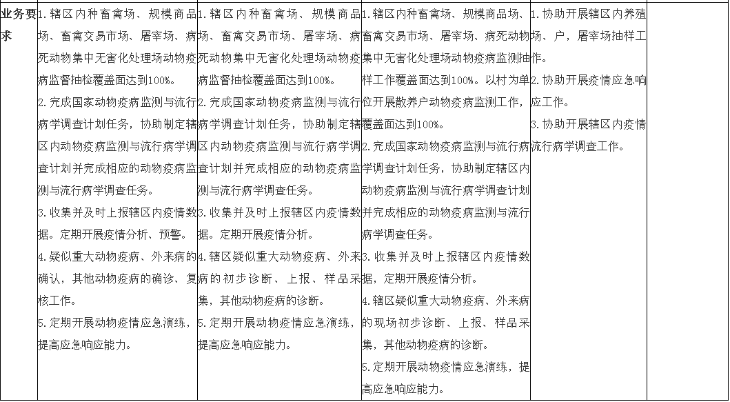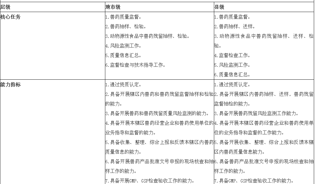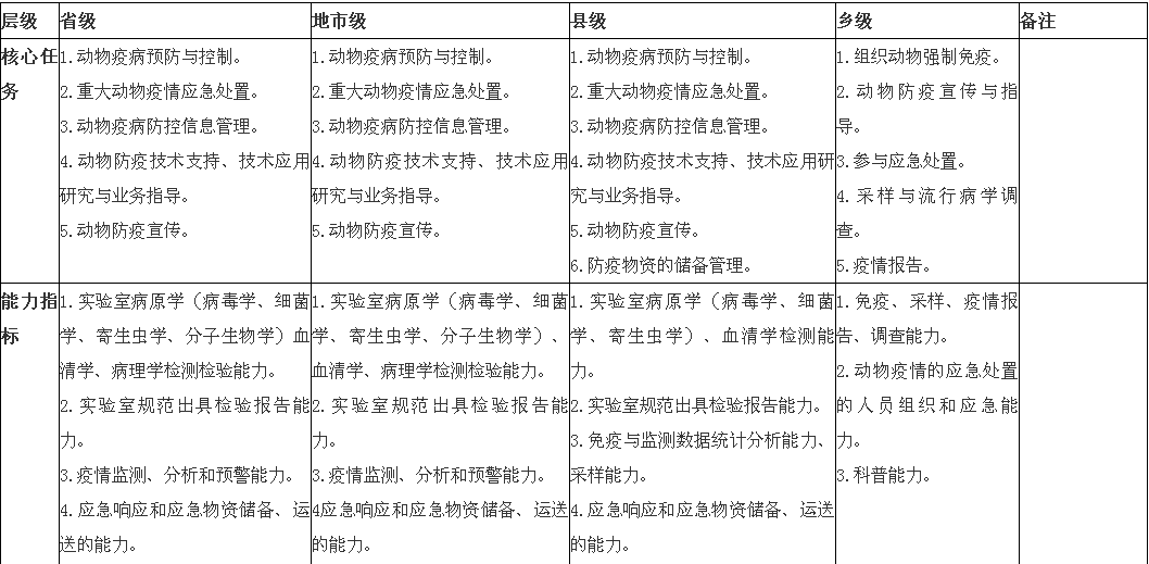 1.健全完善兽医工作体系。深入贯彻中央关于全面深化改革的战略部署,在巩固《国务院关于推进兽医管理体制改革的若干意见》(国发〔2005〕15号)取得成果的基础上,稳定和发展兽医行政管理、动物疫病预防控制、动物卫生监督、兽医药品监察、畜禽屠宰等行业管理机构队伍。建立兽医体系效能评估机制,出台兽医体系效能评估管理办法和兽医机构条件能力建设标准,确立优先发展事项和重点建设任务。根据法律规定,遵循事权和支出责任相适应的原则,加强兽医机构核心能力建设,科学合理配置人力物力财力资源,筑牢兽医体系提供动物疫病风险防治和动物产品质量安全监管等公共服务的平台基础。