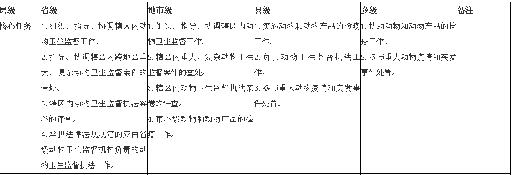 2.调整理顺兽医机构关系。省市县三级,重点理顺监督执法与技术支撑机构之间的关系,建立兽医卫生信息通报、资源共享协作机制;乡镇一级,重点统筹基层监督执法力量、防疫监管力量和兽医服务力量,形成动物疫病预防控制与动物检疫、动物卫生监督执法相互支持,兽医公共管理与社会化服务相互促进的工作格局。