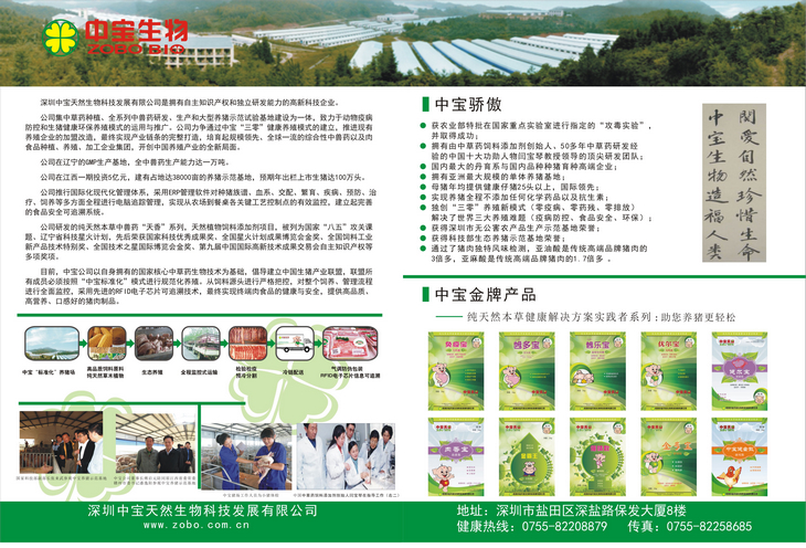 是一家拥有自主知识产权和独立研发能力的高新科技企业。公司集中草药种植、全系列中兽药研发、生产和大型养猪示范基地建设为一体,致力于动物疫病防控和生猪健康环保养殖模式的运用与推广。公司力争通过“中宝模式”的建立,推进现有养殖企业的加盟改造,最终实现产业链条的完整打造,培育起规模领先、全球一流的综合性中兽药、肉食品种植、养殖、加工企业集团,开创中国养猪产业的全新局面。