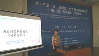 中关村中兽医药产业技术创新战略联盟秘书长,北京农学院中关村开放实验室副主任、中悦民安(北京)科技发展有限公司董事长刘凤华教授向到场的俄蒙京各方介绍了药食同源动物保健成果五月精品猪肉的项目进展。