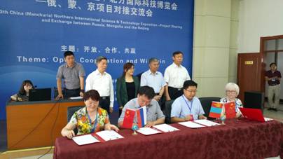 项目对接交流会上中国技术市场协会王兵副秘书长主持了俄蒙京三方签约仪式。北京市技术市场协会副理事长李京瑞、中国科学院原副院长杨柏龄、国家科技部人事司原司长、科技参赞陶元兴、国家科技部火炬中心武毅书记现场助签。中悦民安(北京)科技发展有限公司与俄罗斯伊尔库食品有限公司签订了战略合作协议,共同推动项目尽快落地,服务于国际食品安全。
