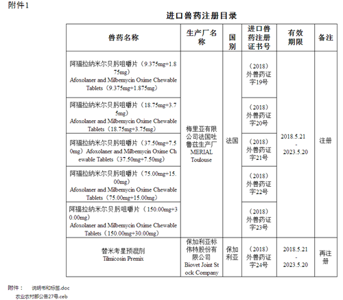 根据《兽药管理条例》和《兽药注册办法》规定,经审核,批准梅里亚有限公司法国吐鲁兹生产厂生产的阿福拉纳米尔贝肟咀嚼片在我国注册,核发《进口兽药注册证书》,并发布产品质量标准、说明书和标签,自发布之日起执行。