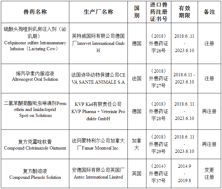 批准安德国际有限公司英国厂生产的复方酚溶液修改兽药包装标签式样和补充完善兽药说明书的安全性内容变更注册,并发布修订后的质量标准、说明书和标签,自发布之日起执行。此前发布的该产品兽药质量标准、说明书和标签同时废止。