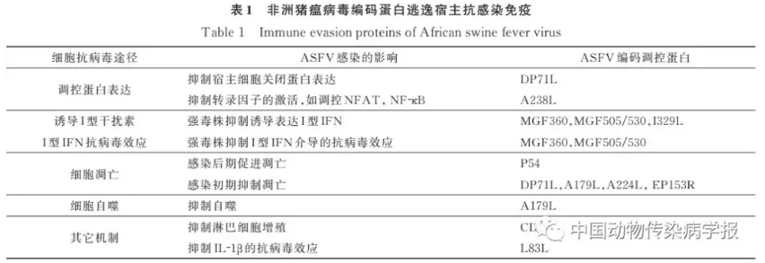 巨噬细胞是ASFV感染的主要靶细胞,病毒主要通过肌动蛋白介导的内吞作用和巨胞饮作用进入巨噬细胞,随后病毒内层囊膜与次级内体融合,病毒核心被释放到细胞质中。ASFV主要在巨噬细胞内完成复制、组装及子代病毒颗粒的释放,病毒表达自身DNA聚合酶、连接酶和核酸内切酶等保证复制的准确性。已有研究表明,ASFV基因组可编码多种蛋白质,用以调控宿主细胞蛋白表达、干扰宿主天然免疫系统和调控细胞周期等,从而抑制和逃避宿主的免疫应答反应,为自身增殖、扩散创造有利条件。ASFV编码的免疫逃逸蛋白按功能主要分为以下几类:①调控宿主细胞蛋白表达系统及细胞因子的转录,如DP71L和A238L等;②抑制Ⅰ型干扰素信号通路,如多基因家族蛋白MGF360、MGF505/530和I329L等; ③调控细胞程序性死亡,包括p54、A179L、A224L和EP153R等; ④其它免疫抑制蛋白,如CD2v、L83L等(表1)。