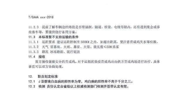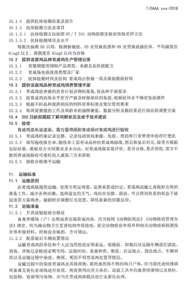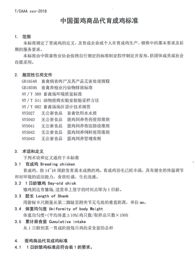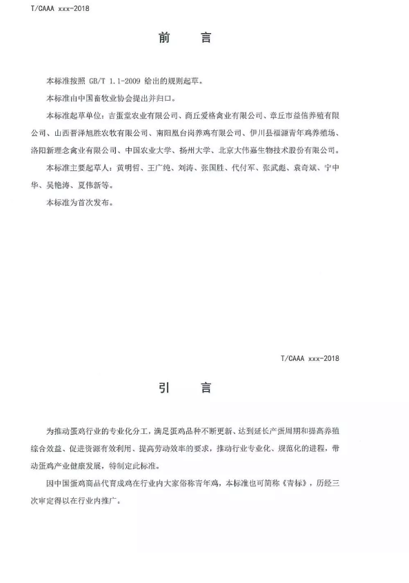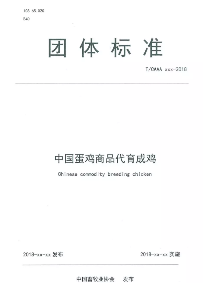 为推动蛋鸡行业的专业化分工,满足蛋鸡品种不断更新、达到延长产蛋周期和提高养殖综合效益、促进资源有效利用、提高劳动效率的要求,推动行业专业化、规范化的进程,带动蛋鸡产业健康发展,由中国畜牧业协会联合吉蛋堂农业有限公司、商丘爱格禽业有限公司、章丘市益信养殖有限公司、山西晋泽旭胜农牧有限公司、南阳凰台岗养鸡有限公司、伊川县福源青年鸡养殖场、洛阳新理念禽业有限公司、中国农业大学、扬州大学、北京大伟嘉生物技术股份有限公司10家蛋鸡相关企业高校联合发布了《中国蛋鸡商品代育成鸡》团体标准,目前面向社会征求意见。
