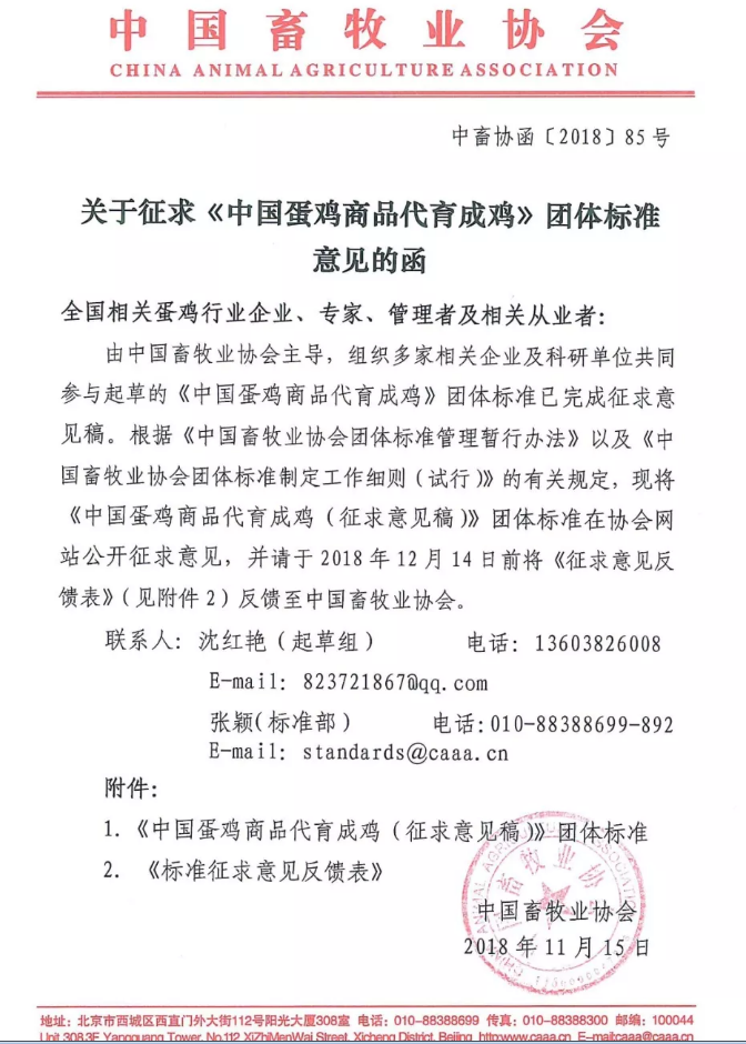 由中国畜牧业协会主导,组织多家相关企业及科研单位共同参与起草的《中国蛋鸡商品代育成鸡》团体标准已完成征求意见稿。根据《中国畜牧业协会团体标准管理暂行办法》以及《中国畜牧业协会团体标准制定工作细则(试行)》的有关规定,现将《中国蛋鸡商品代育成鸡(征求意见稿)》团体标准在协会网站公开征求意见,并请于2018年12月14日前将《征求意见反馈表》(见附件2)反馈至中国畜牧业协会。
