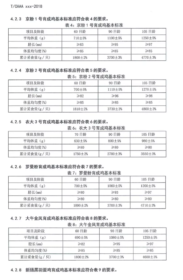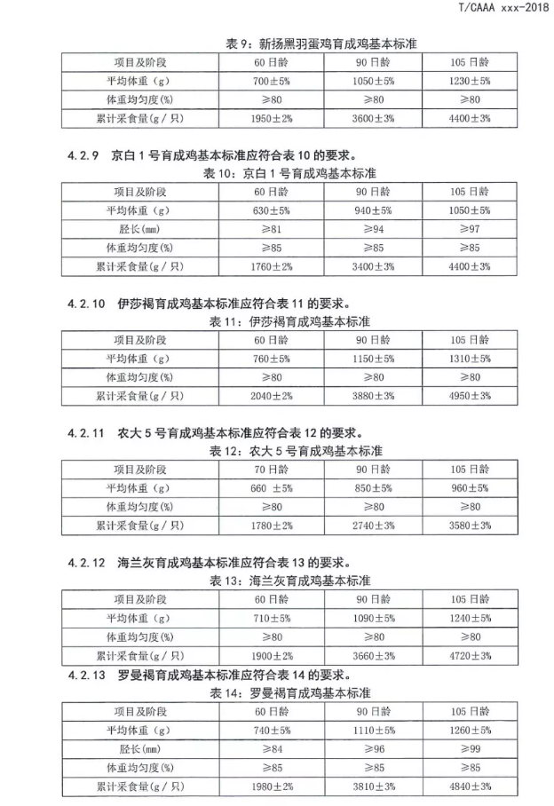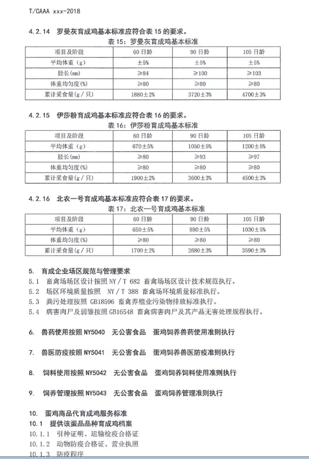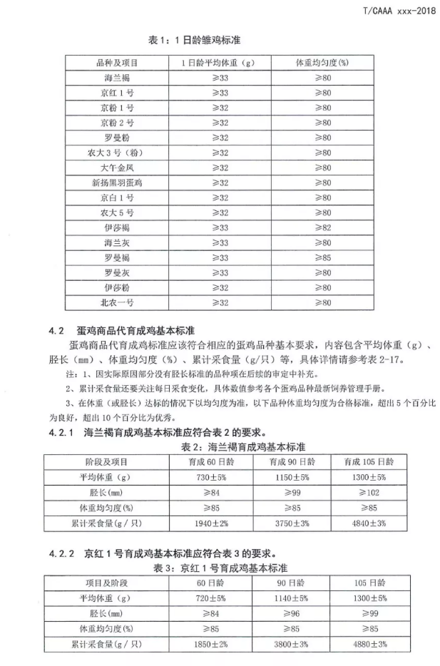 该团体标准规定了海兰褐、京红1号、京粉1、2号、罗曼粉、罗曼褐、罗曼灰、农大3号(粉)、农大5号、大午金凤、新扬黑羽蛋鸡、京白1号、伊莎褐、伊莎粉、海兰灰、北农一号等16个品种蛋鸡1日龄的平均体重及体重均匀度,育成60日龄、90日龄、105日龄的平均体重(g)、胫长(mm)、体重均匀度(%)、累计采食量(g/只)等基本要求。