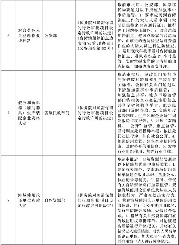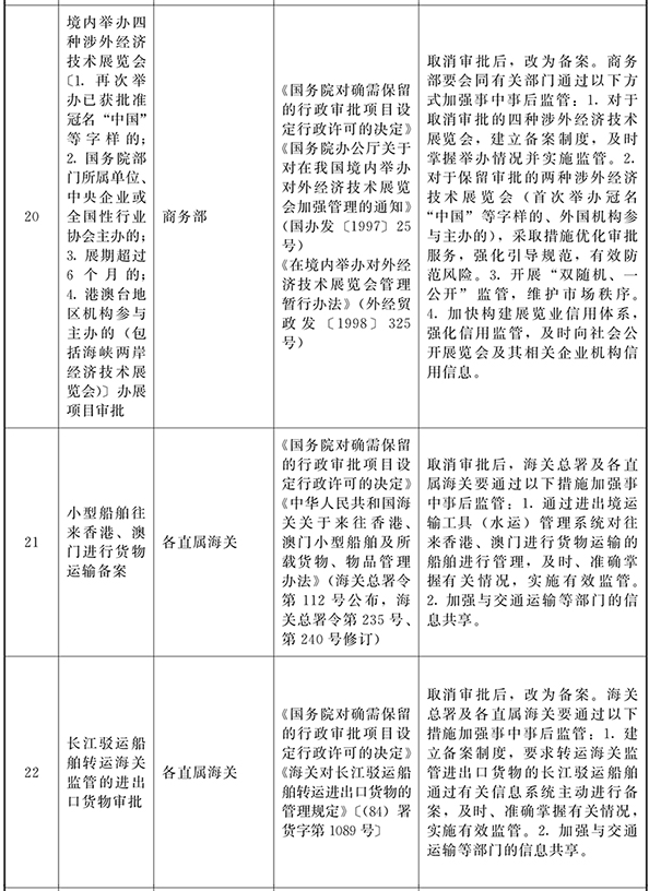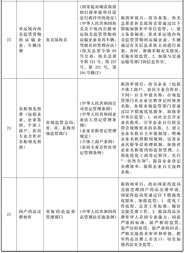 经研究论证,国务院决定取消25项行政许可事项,下放6项行政许可事项的管理层级,现予公布。另有5项依据有关法律设定的行政许可事项,国务院将依照法定程序提请全国人民代表大会常务委员会修订相关法律规定。