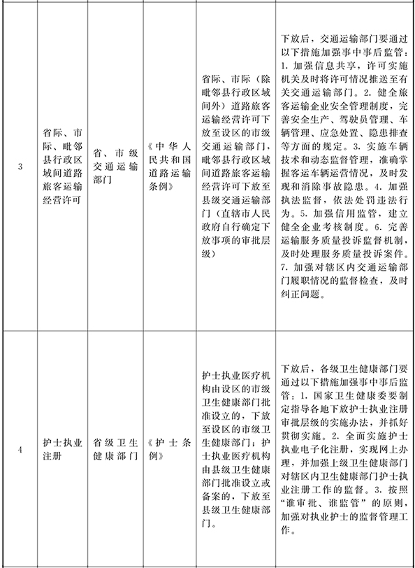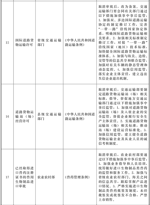 各地区、各有关部门要抓紧做好取消和下放行政许可事项的落实和衔接工作,制定完善事中事后监管措施,采取“双随机、一公开”监管、重点监管、信用监管、“互联网+监管”等方式,确保放得开、接得住、管得好。自本决定发布之日起20个工作日内,各有关部门要按规定向社会公布事中事后监管细则,并加强宣传解读和督促落实。