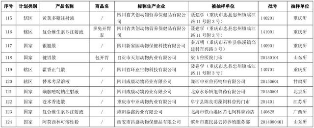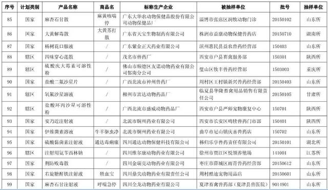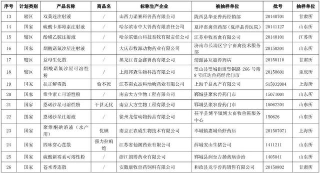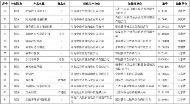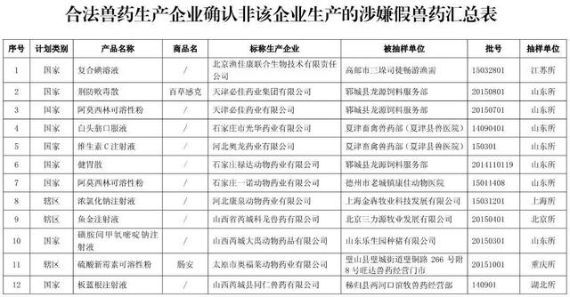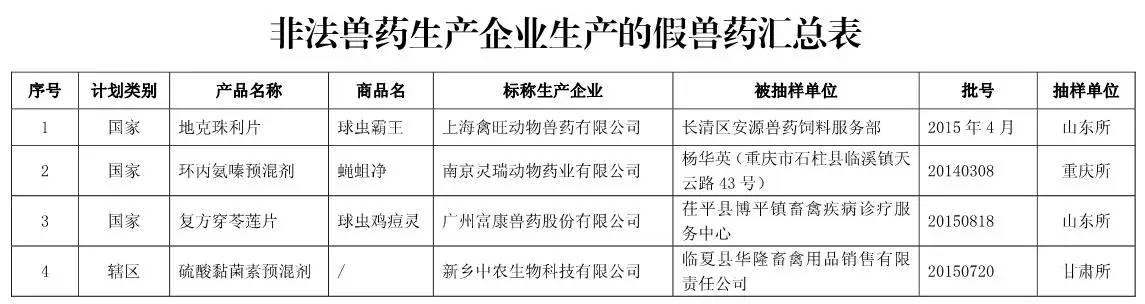 近日,山东省兽药监察所等10个省级兽药检验机构报送了2015年11月份兽药监督抽检中经抽样确认的128批假兽药相关信息。其中,非法兽药生产企业4家(附件1),涉及假兽药4批(附件2);合法兽药生产企业确认非该企业生产的涉嫌假兽药124批(附件3)。请各级兽医行政管理部门按照从重处罚兽药违法行为公告(农业部公告第2071号)规定和以下要求组织查处。